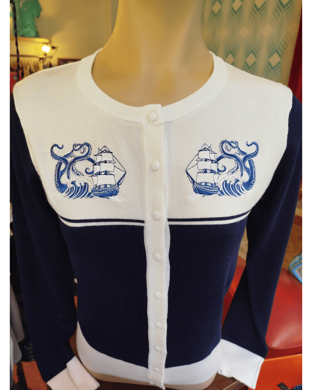 Chaqueta estilo universitaria en azul marino muy oscuro y blanco roto, con bordados old school,  un Kraken y un barco, qué podría salir mal?
